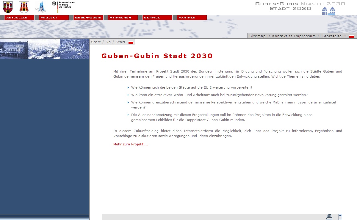 Mit ihrer Teilnahme am Projekt Stadt 2030 des Bundesministeriums für Bildung und Forschung (BMBF) wollen sich die Städte Guben und Gubin gemeinsam den Fragen und Herausforderungen ihrer zukünftigen Entwicklung stellen. In diesem Zukunftsdialog bietet diese Internetplattform die Möglichkeit, sich über das Projekt zu informieren, Ergebnisse und Vorschläge zu diskutieren sowie Anregungen und Ideen einzubringen.