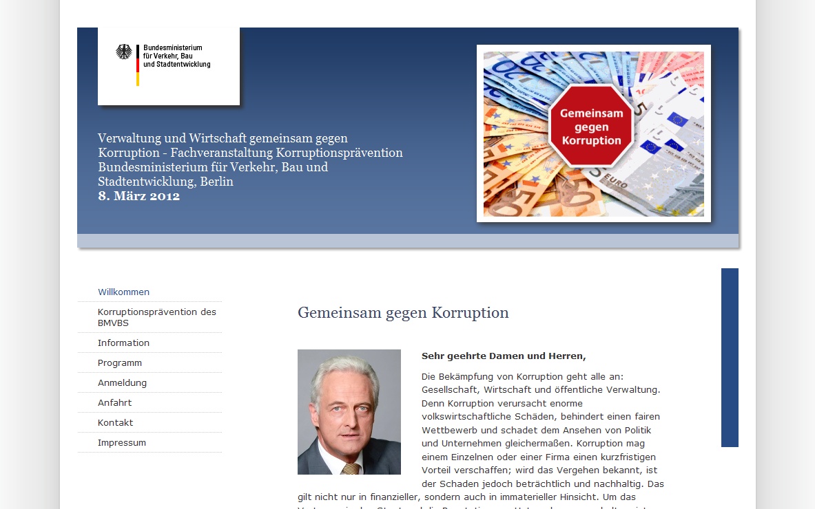 Internetauftritt mit Registrierung und Datenmanagement für die Fachveranstaltung Korruptionsprävention des BMVBS