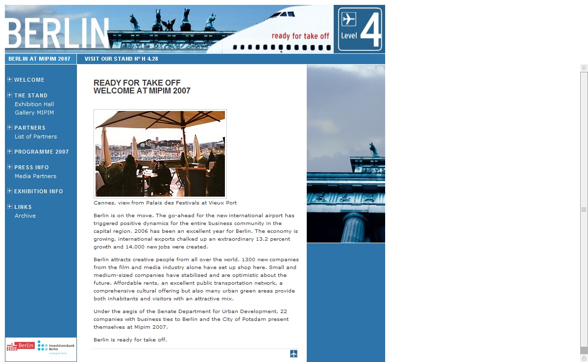 Die MIPIM in Cannes gilt als größte Immobilienmesse Europas. Das Land Berlin ist dort mit einem umfangreichen Messestand vertreten, an dem etwa 20 Projektentwickler und Investoren als Partner beteiligt sind. Die Gesamtkoordination und das Key-Visual-Design für die Umsetzung liegt bei der Werbeagentur Runze & Casper.