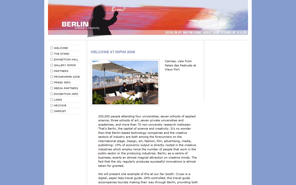 Die MIPIM in Cannes gilt als größte Immobilienmesse Europas. Das Land Berlin ist dort mit einem umfangreichen Messestand vertreten, an dem etwa 20 Projektentwickler und Investoren als Partner beteiligt sind. Die Gesamtkoordination und das Key-Visual-Design für die Umsetzung liegt bei der Werbeagentur Runze & Casper.