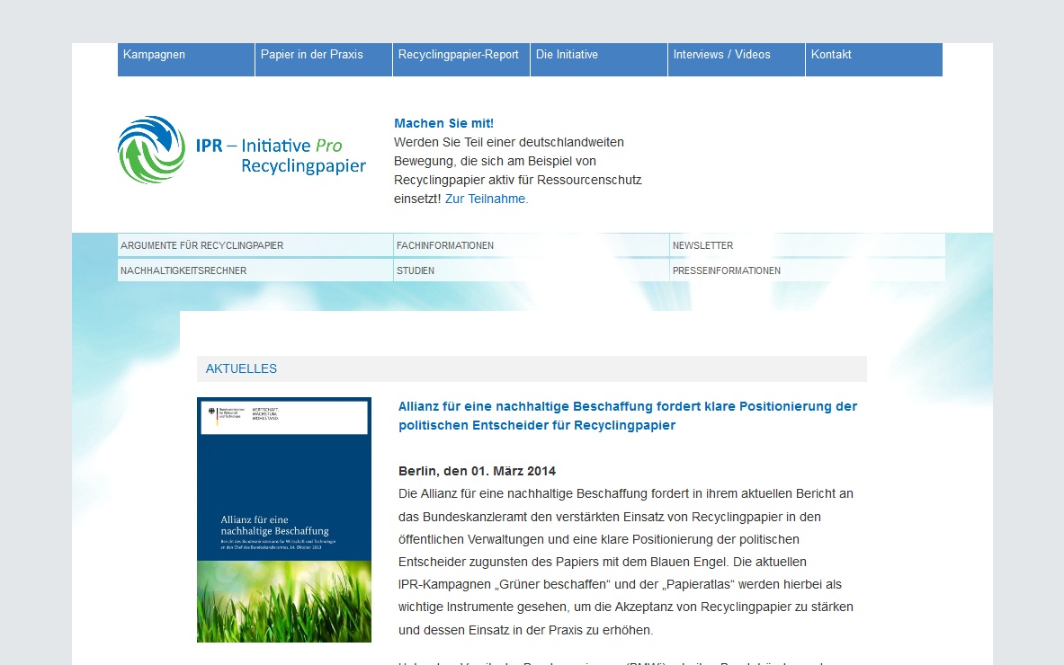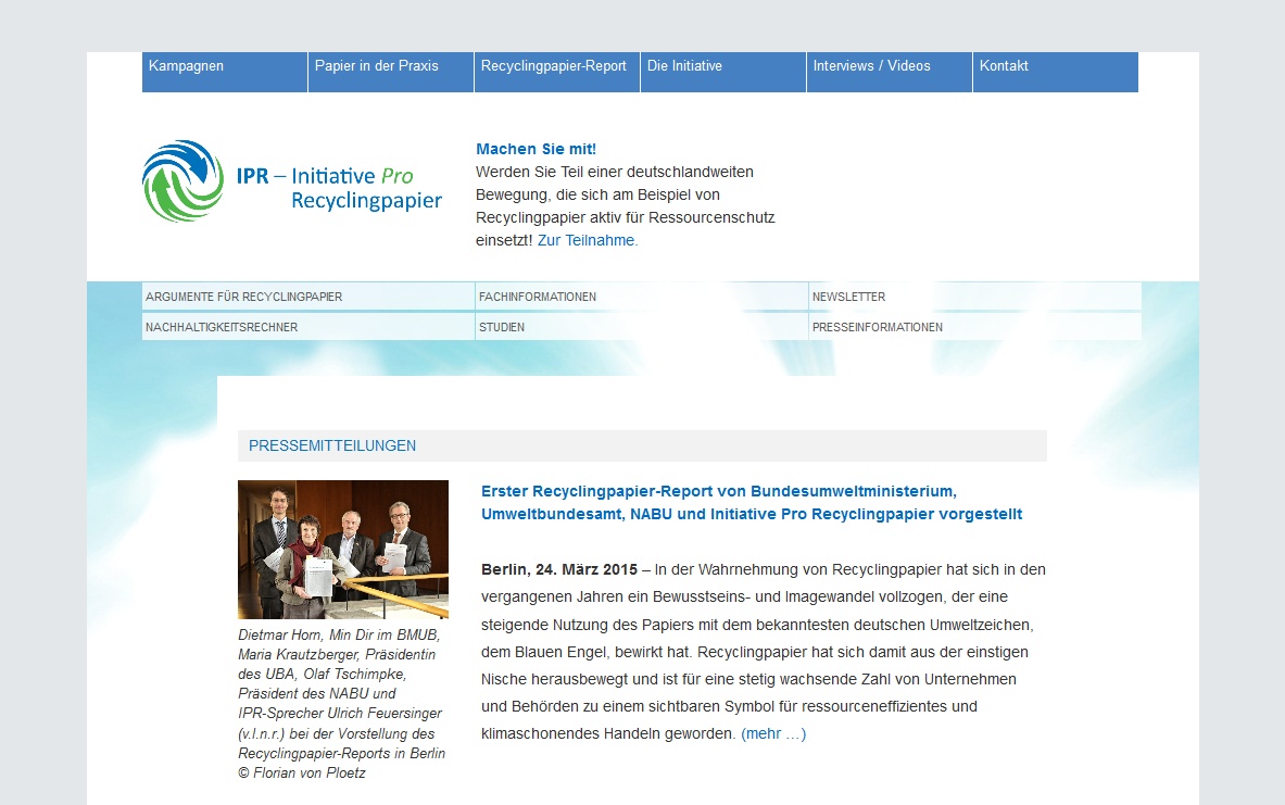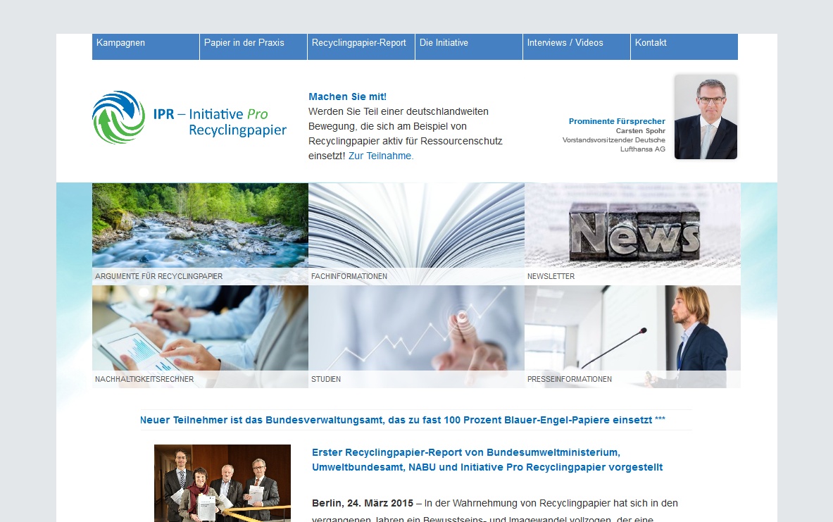 Die Initiative Pro Recyclingpapier (IPR) ist eine Wirtschaftsallianz 25 namhafter Unternehmen, die im August 2000 in Berlin gegründet wurde. Wichtige Partner der IPR sind das Umweltbundesamt, die Deutsche Bundesstiftung Umwelt, der Deutsche Städtetag, der Bundesverband der Verbraucherzentralen und der NABU. Aufgabe ist es, Unternehmen, Behörden und Verbraucher gezielt beraten und bei Umstellungsprozessen zu begleiten, Aufmerksamkeitsstarke Informationskampagnen und öffentliche Aktionen umzusetzen sowie als Kompetenzzentrum und Anlaufstelle für Fragen rund um den Einsatz Recyclingpapier aufzutreten. Im Rahmen ihrer Tätigkeit werden durch die IPR sechs Webseiten betreut, die unterschiedliche Funktionen erfüllen aber alle zum Thema Recyclingpapier ausgerichtet sind.