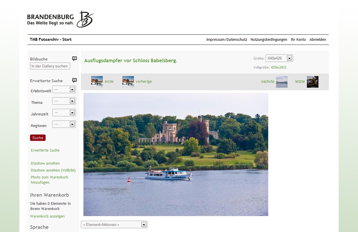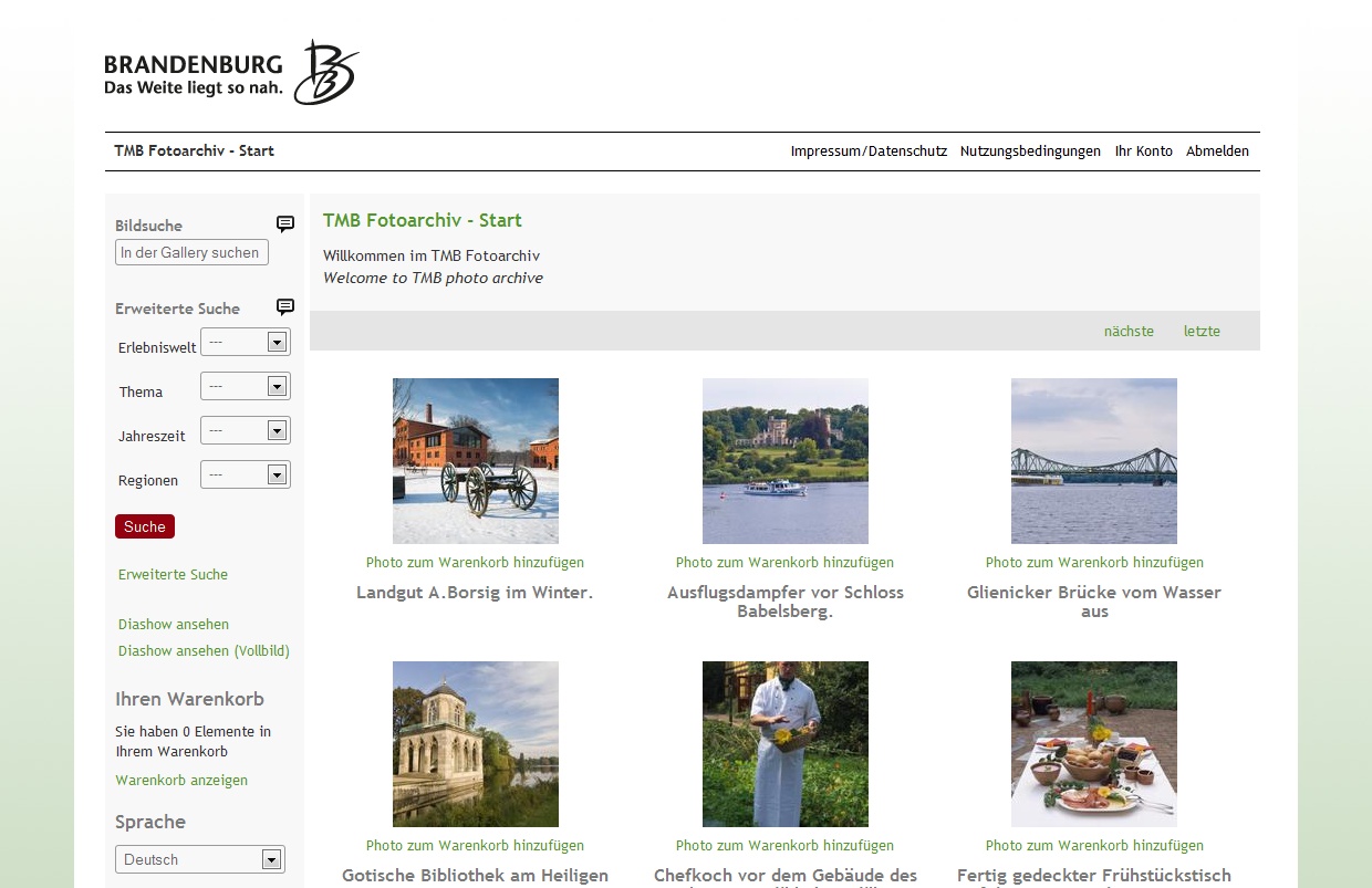 Die Tourismus Marketing Brandenburg ist die zentrale Institution zur Vermarktung von Reisezielen im Land Brandenburg. Zur Unterstützung dieser Arbeit wurde ein zentrales Fotoarchiv mit touristischen Motiven erstellt, das registrierten Nutzern zur kostenlosen Verfügung steht. Eine umfangreiche Suchfunktion ermöglicht es den Nutzern zielgerichtete Fotos zu finden, die dann in hoher Auflösung heruntergeladen werden können. Das Archiv wird durch den Kunden ständig erweitert. Das System ist in Deutsch und Englisch ausgelegt, um auch internationale Nutzer anzusprechen.