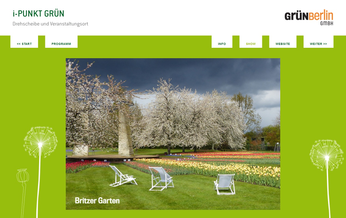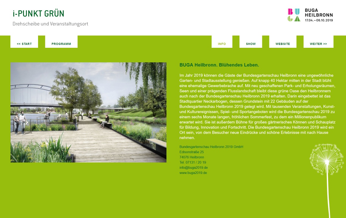 Von April bis Oktober 2017 lädt die IGA Berlin 2017 zu einem erlebnisreichen und überraschenden Festival schönster internationaler Gartenkunst und grüner urbaner Lebenskultur ein. Wer neben dem Genießen der Pflanzenpracht auf dem Gartenschaugelände auch noch etwas über die Vielfältigkeit von Pflanzen und Floristik erfahren möchte, ist am i-Punkt GRÜN genau richtig. Als multimediale Ergänzung zu diesem Angebot hat Netzformat eine interaktive Applikation entwickelt, die Informationen, Bilder und Videos zu den beteiligten Partnern visualisiert. Der Touchscreen steht den Besuchern im Gebäude der berühmten Seilbahn-Station zur Verfügung.